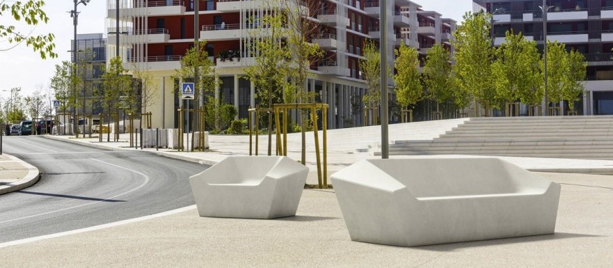 Le design des bancs et sièges CUTTING, graphique et innovant, est inspiré par les fauteuils et canapés d'intérieur.